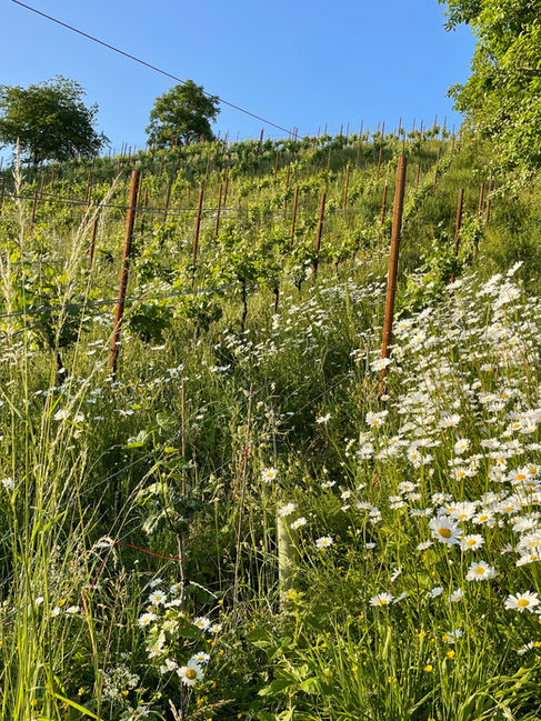 Our vineyard is surrounded by protected biotopes and we strive to keep our vineyard as close to nature as possible. We never plough between the rows and mow only twice a year, so as to preserve biodiversity and permit plants to have flowers for insects, notably bees.