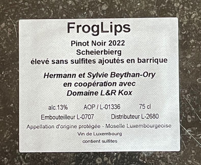 The wine is made from Pinot Noir grapes grown in a small vineyard in Erpeldange-Bous near Remich in the Grand Duchy of Luxembourg.